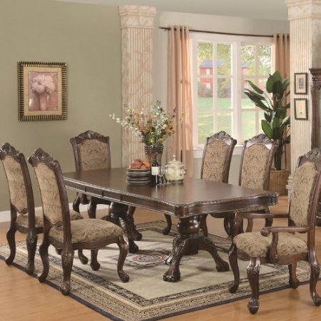 Andrea Traditional Double Pedestal Dining Table. The impressive Andrea dining collection features rich carvings and fine accents. This large table group features a double pedestal table base and leaf that extends the table to accommodate extra guests.You will receive a total of 1 table, 4 side chairs and 2 arm chairs. Assembly required. Table: 82"L 112"L x 44"W x 31"H; Side chairs: 30"L x 24.5"W x 48"H; Arm chairs: 30"L x 29.5"W x 48"H Seat Height: 18" Seat Depth: 20.5"